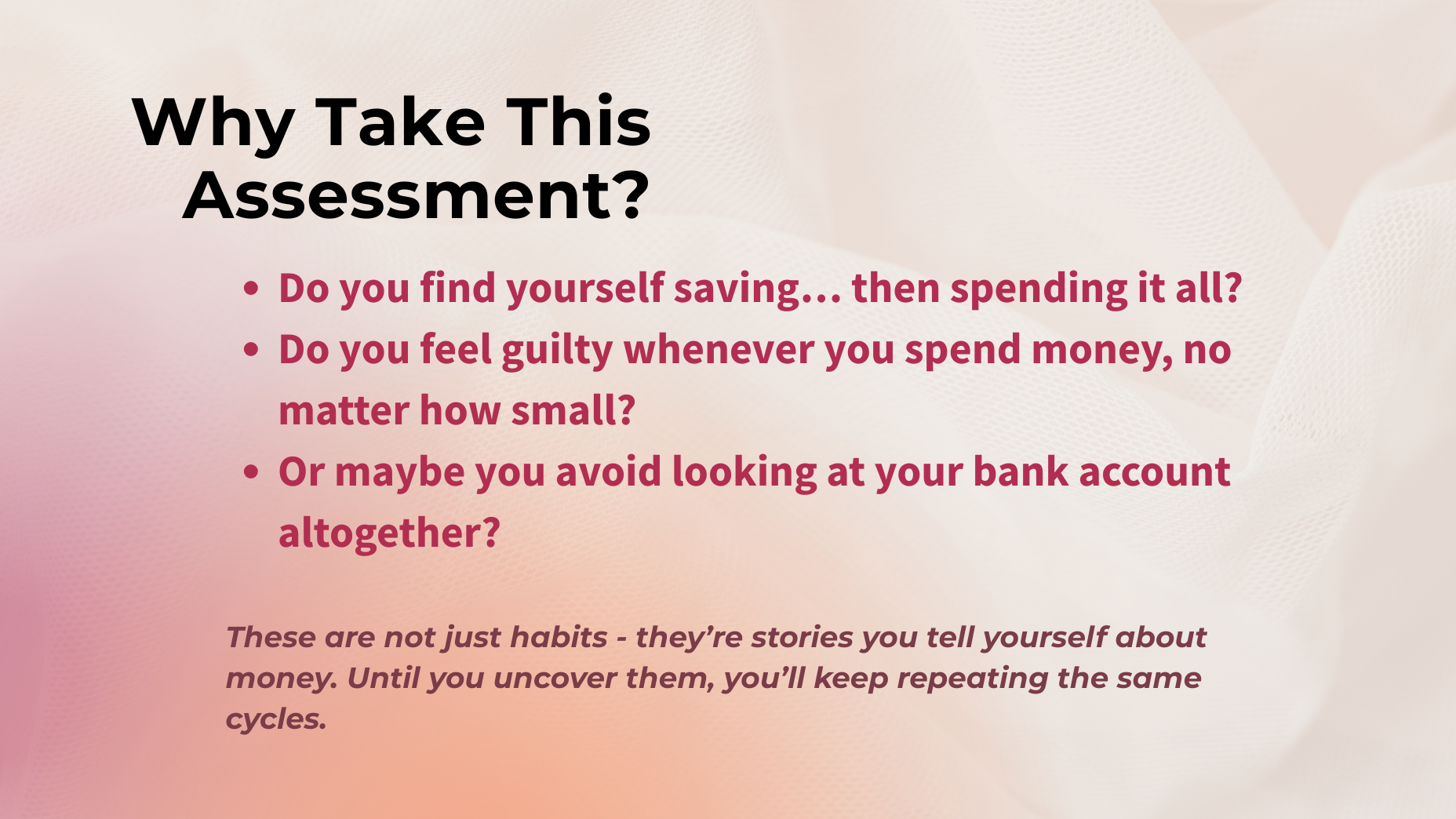 Your money habits aren’t random. They’re guided by subconscious money scripts - stories you’ve carried since childhood. Take this free assessment and uncover the beliefs behind your financial decisions.